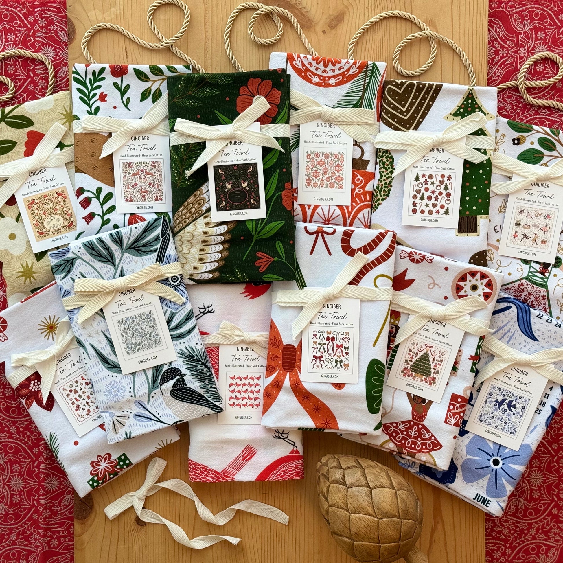 Brighten up your holiday kitchen with 12 unique holiday tea towels, each featuring a festive Gingiber design. Made from oversized, high-quality flour sack cotton, these towels are as absorbent as they are beautiful—perfect for decking the halls, drying dishes, or gifting throughout the season.
