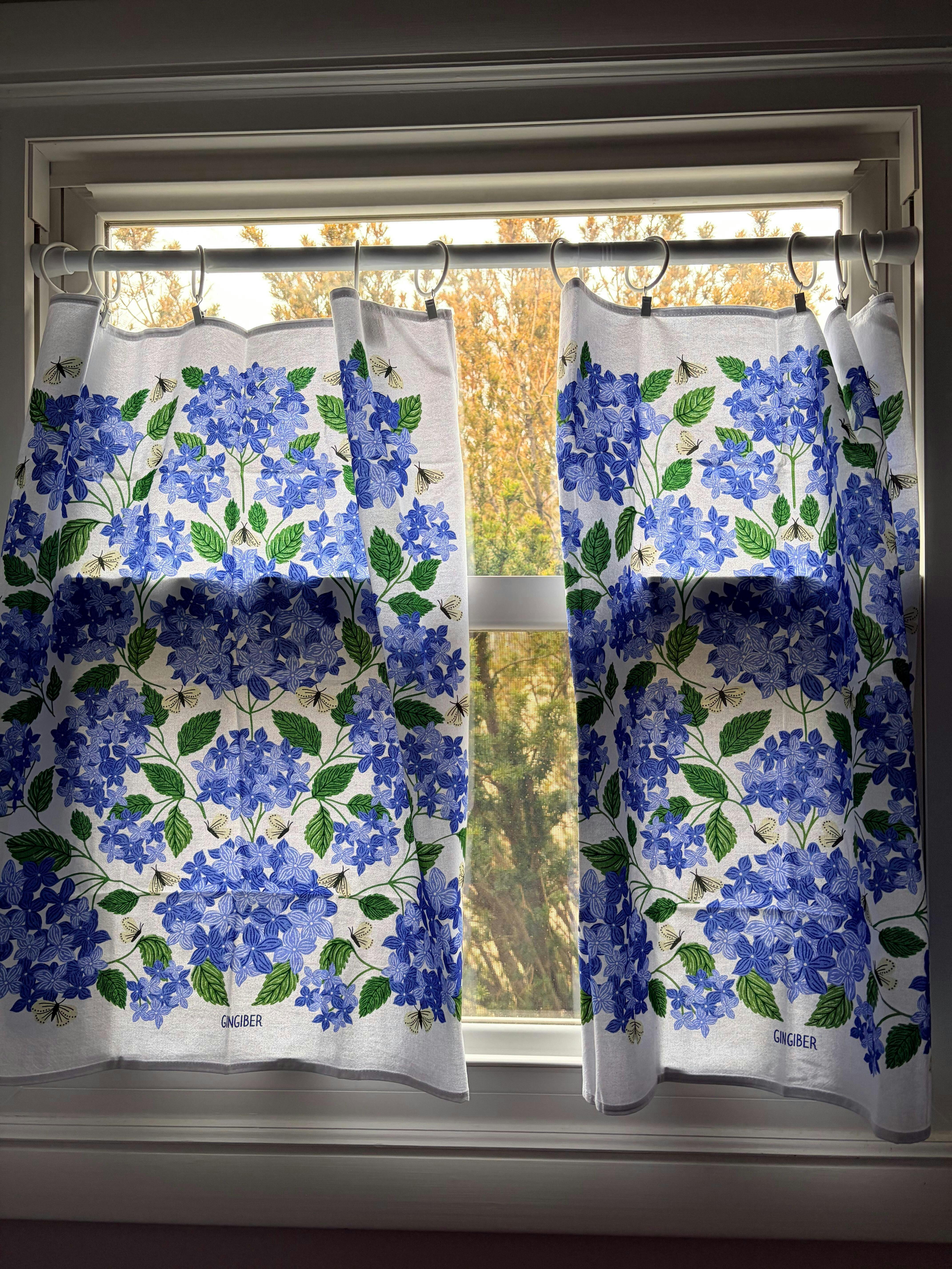 Buy this set of two of our bestselling Blue Hydrangea tea towel curtains and turn your cafe window into a work of art! (hardware not included)