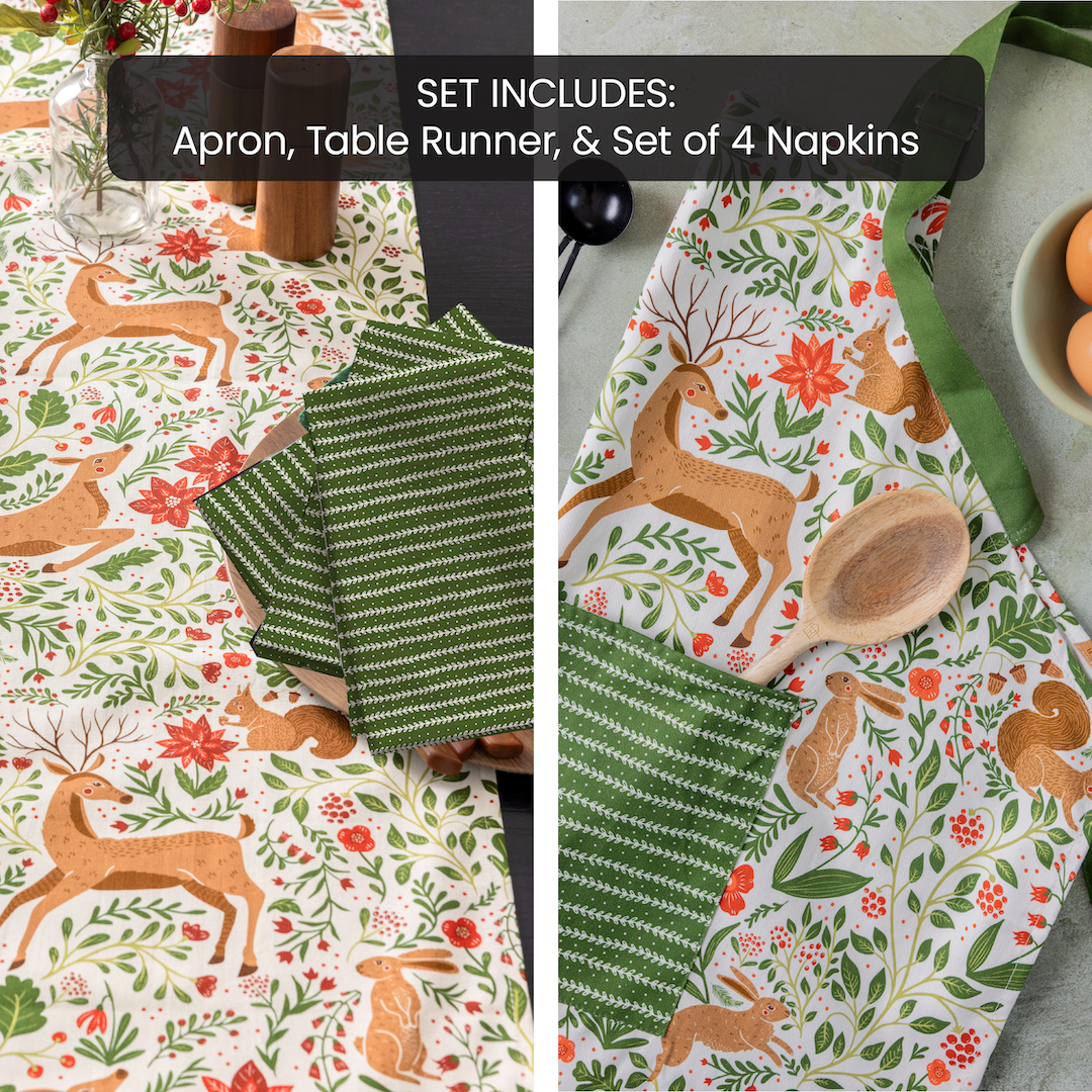 This beautifully coordinated collection includes a table runner, cloth napkins, and a matching apron—all featuring exclusive, hand-illustrated designs. Thoughtfully crafted for effortless hosting, it’s the perfect way to add charm to your gatherings or gift to someone who loves to entertain!